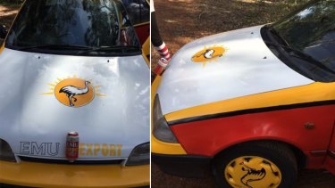 Limu emu and doug drive a liberty mutual car with a siren on top.