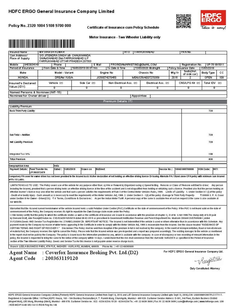 Vikash Kumar Up76w5011 Policy Copy Liability Insurance Vehicle