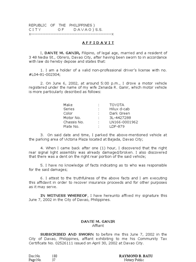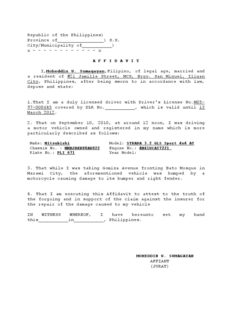 Doc Affidavit Of Damage Vehicle Erwin Idala Academia Edu